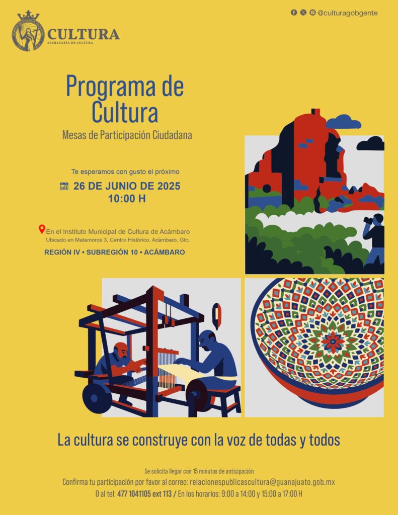 A nivel estatal, realizan Foros Ciudadanos para integrar el Plan de Cultura 2025-2030; en Acámbaro, el evento es el jueves 26 de junio Publicada el 21 junio, 2025 Fuente: Gobierno del Estado de Guanajuato Compartir en redes socialesTweet Share on Telegram (Se abre en una ventana nueva) Telegram Share on WhatsApp (Se abre en una ventana nueva) WhatsApp Me gusta esto:Me gusta Cargando... Relacionado Navegación de entradas « Debido a la inseguridad por internet, se alerta a la población para prevenir toda clase de fraudes digitalesREFLEXIÓN DOMINICAL DEL PADRE PISTOLAS »
