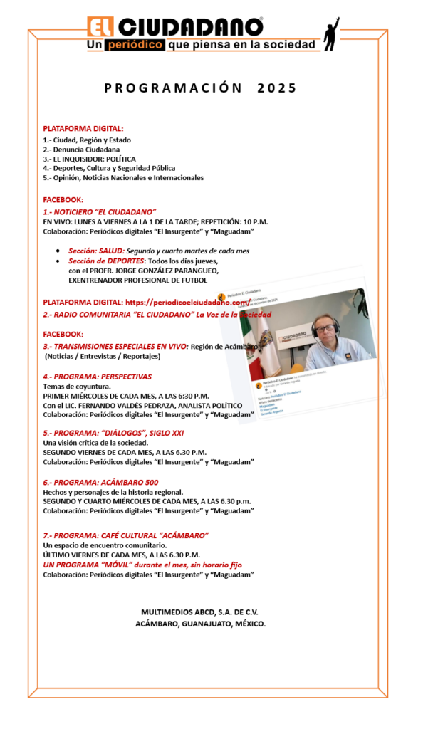 A partir de junio, manténganse actualizado(a) con la programación del periódico digital “El Ciudadano” Publicada el 4 agosto, 2025 Fuente: Multimedios ABCD, S.A. de C.V. Compartir en redes socialesTweet Share on Telegram (Se abre en una ventana nueva) Telegram Share on WhatsApp (Se abre en una ventana nueva) WhatsApp Me gusta esto:Me gusta Cargando... Relacionado Navegación de entradas « Caminar, es una nueva forma para reducir la presión sanguínea y el estrés,a la vez de que ayuda a una mejor salud mentalLos Centros Migrantes siembran oportunidades en Guanajuato »