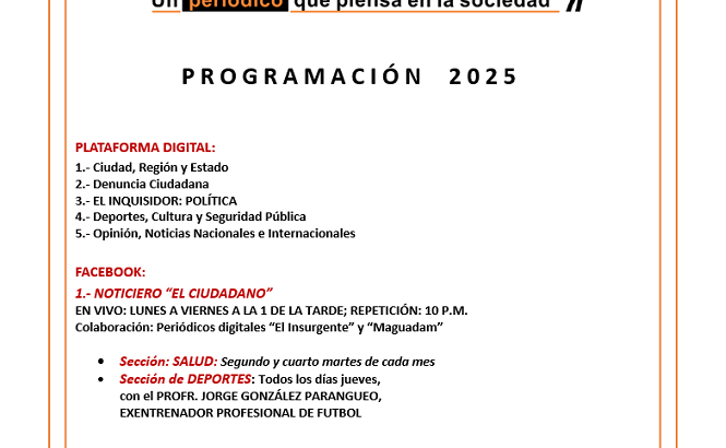 A partir de junio, manténganse actualizado(a) con la programación del periódico digital “El Ciudadano” Publicada el 26 mayo, 2025 Fuente: Multimedios ABCD, S.A. de C.V. Compartir en redes socialesTweet Share on Telegram (Se abre en una ventana nueva) Telegram Share on WhatsApp (Se abre en una ventana nueva) WhatsApp Me gusta esto:Me gusta Cargando... Relacionado Navegación de entradas « Entre las 100 marcas más valiosas del 2025, Apple, Google y Microsoft se afianzaron en las primeras posiciones.Secretarías suman esfuerzos a favor del desarrollo humano y la reintegración social »