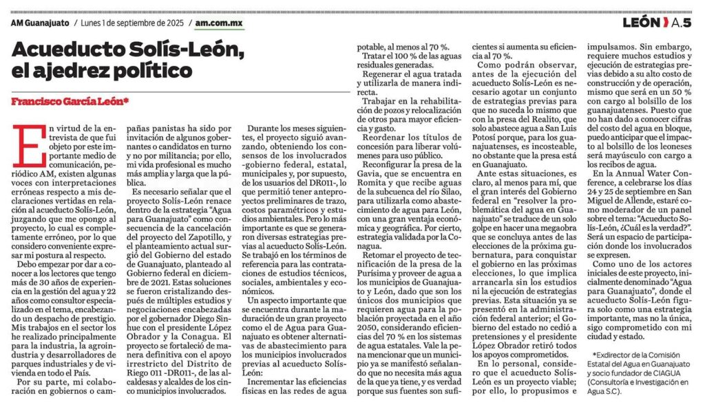 Acueducto Solís-León, el ajedrez político Columna de Francisco García León Publicada el 7 septiembre, 2025 Fuente: LXA News Compartir en redes socialesTweet Share on Telegram (Se abre en una ventana nueva) Telegram Share on WhatsApp (Se abre en una ventana nueva) WhatsApp Me gusta esto:Me gusta Cargando... Relacionado Navegación de entradas « Guanajuato consolida su posición como líder en la inversión extranjera En todo ecosistema del planeta, es necesaria la polinización para el desarrollo de los productos agrícolas »