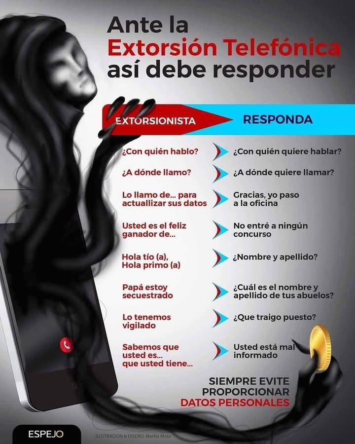 Ante una amenaza por una posible extorsión, es conveniente saber responder; pero lo mejor, es no contestar números que no se conozcan Publicada el 18 abril, 2026 Fuentes: Martín Mota / Espejo Compartir en redes socialesTweet Share on Telegram (Se abre en una ventana nueva) Telegram Share on WhatsApp (Se abre en una ventana nueva) WhatsApp Me gusta esto:Me gusta Cargando... Relacionado Navegación de entradas « Walmart tarda 48 segundos en generar 1 millón de dólares, a través de sus empresas a nivel internacionalA través de la historia, la Selección de Italia no ha participado en 5 Mundiales: 1930-2026 »