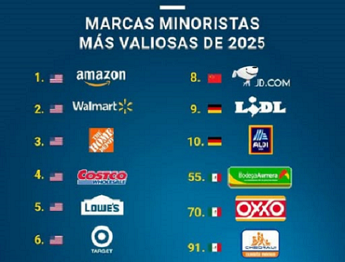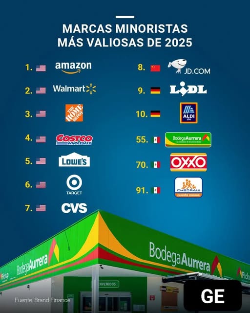 Aurrerá, Oxxo y Chedraui son las marcas más valiosas de México en el 2025, en una lista global de 100 empresas a nivel internacional. Publicada el 15 agosto, 2025 Fuentes: Brand Finance / GE Compartir en redes socialesTweet Share on Telegram (Se abre en una ventana nueva) Telegram Share on WhatsApp (Se abre en una ventana nueva) WhatsApp Me gusta esto:Me gusta Cargando... Relacionado Navegación de entradas « El Acueducto Solís-León tendrá un costo de 15 mil millones de pesos y estará listo en 5 años: 2025-2029.Marca Guanajuato sigue impulsando la economía regional de Guanajuato »
