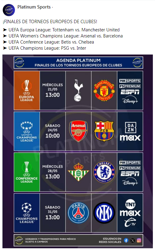 Cuatro son las finales del fútbol europeo para mayo, entre ellas, una femenil Publicada el 20 mayo, 2025 Fuentes: FIFA / UEFA / Platinum Sports Compartir en redes socialesTweet Share on Telegram (Se abre en una ventana nueva) Telegram Share on WhatsApp (Se abre en una ventana nueva) WhatsApp Me gusta esto:Me gusta Cargando... Relacionado Navegación de entradas « Guanajuato certifica a más de 4 mil 300 personas en perfiles laboralesRecibe el INE Guanajuato las boletas para la elección judicial del 1 de junio »