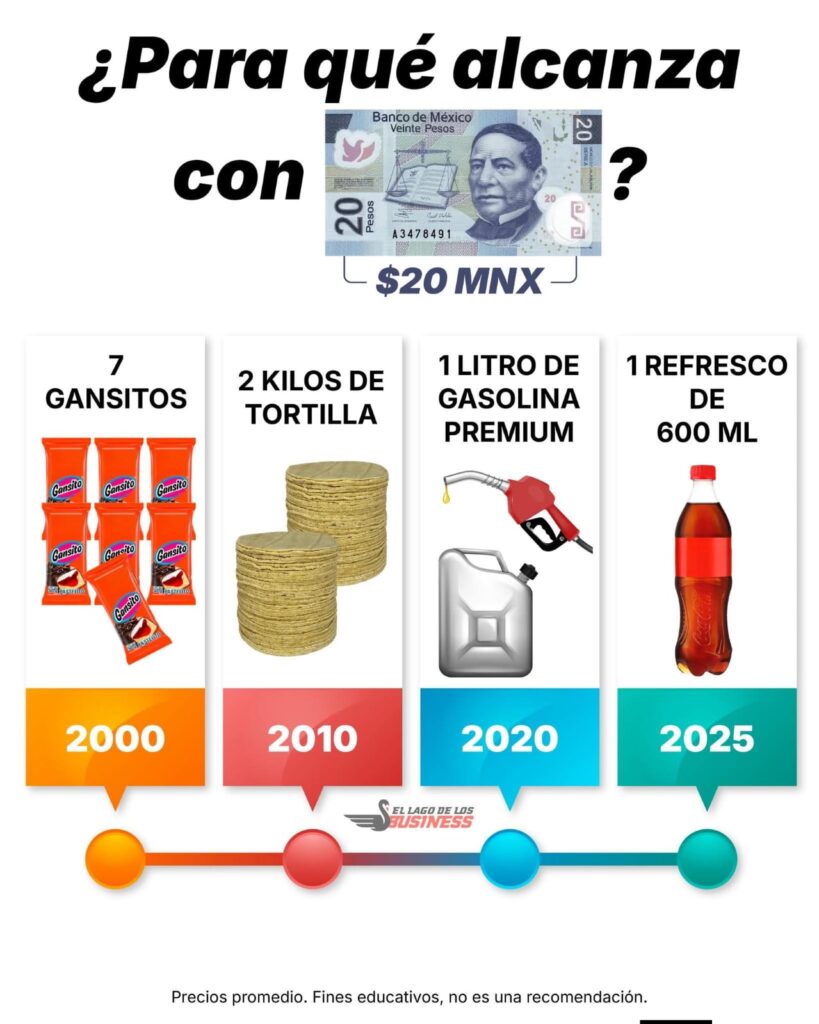 Debido a los efectos de la inflación nacional, hoy en día se compran menos cosas, sobre todo con un billete de 20 pesos Publicada el 27 marzo, 2026 Fuente: El Lago de los Business Compartir en redes socialesTweet Share on Telegram (Se abre en una ventana nueva) Telegram Share on WhatsApp (Se abre en una ventana nueva) WhatsApp Me gusta esto:Me gusta Cargando... Relacionado Navegación de entradas « Guanajuato avanza en la evaluación del Servicio Nacional de EmpleoEn América Latina hay 10 leyendas del futbol, incluyendo al mexicano Hugo Sánchez »