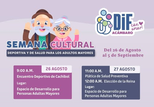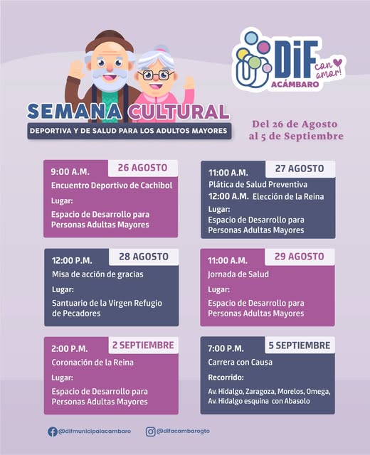 Del 26 de agosto de septiembre, el DIF de Acámbaro realiza la Semana del Adulto Mayor Publicada el 20 agosto, 2025 Fuente: Gobierno Municipal de Acámbaro, Gto. Compartir en redes socialesTweet Share on Telegram (Se abre en una ventana nueva) Telegram Share on WhatsApp (Se abre en una ventana nueva) WhatsApp Me gusta esto:Me gusta Cargando... Relacionado Navegación de entradas « Entre los beneficios de consumir café con moderación, figuran el prevenir ataques cardíacos, diabetes tipo 2 y bajar de pesoEl Inquisidor: Pese a los opositores de Jalisco, se hará el Acueducto Solís-León. Nuevo ‘Modelo Educativo’ para el Sistema Nacional de Bachillerato. Necesario, distribuir bien las áreas para estacionamiento de vehículos y motos. La inseguridad, un problema vigente en municipios de Guanajuato. »