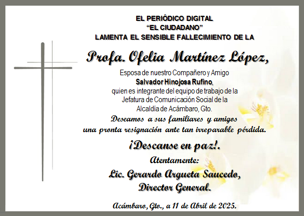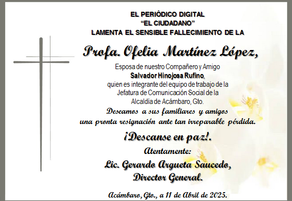 Se une a la pena que embarga a nuestro amigo y compañero Salvador Hinojosa Rufino por el sensible fallecimiento de su esposa Profa. Ofelia Martínez López.