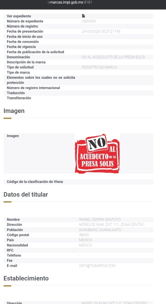 4.- Buscan registrar ante el IMPI, la frase: “No al Acueducto de la Presa Solís”.- Un tema que ha causado interés, es el hecho de que Rafael Sierra, uno de los “lederes” del Movimiento “No al Acueducto”, busca registrar ante el Instituto Mexicano de la Propiedad Industrial (IMPI), la frase: “No al Acueducto de la Presa Solís”, lo que se maneja como un ‘logotipo’. Tiene el Número de Expediente: 3584528, con fecha del 24 de marzo de 2026. Es así entonces que algunos Abogados (que no abogan ni por ellos mismos), consideran que no podría proceder, en virtud de que es una consigna política y no propiamente, una marca comercial. Otros, destacan que sí procede porque sería el antecedente de una organización social y/o política que tendría el mismo logo como imagen. Lo cierto, es que causa una atención especial. Ya dirá el IMPI qué decide sobre la solicitud de registro de tan singular frase. Ya lo dirá!.