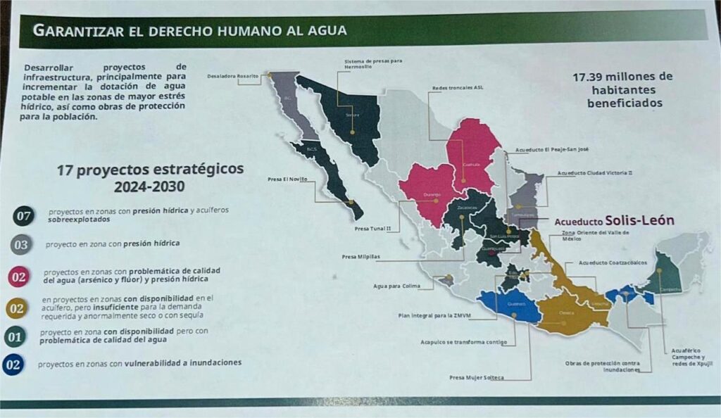 1.- Habrá 4 Acueductos en el país, con el Plan Hídrico 24-30 del Gobierno federal.- El Plan Hídrico 24-30 de la Presidenta Claudia Sheinbaum, inserto en la llamada “Agenda del Agua” de la Organización de las Naciones Unidas (ONU), incluye 17 proyectos estratégicos para el país, entre ellos, la construcción de 4 Acueductos. Es decir, no sólo el Acueducto Solís-León estará vigente sino tres más, que son los de Ciudad Victoria II, en Tamaulipas; el de Peaje-San José en San Luis Potosí y el de La Cangrejera-Coatzacoalcos en Veracruz. Los demás proyectos giran en torno a la construcción de presas, sistemas de presas y redes troncales, sin faltar un acuaférico para Campeche. Los 17 proyectos deben quedar listos para el 2029, a fin de inaugurarse en el 2030. El común denominador es llevar agua de una región donde la hay a otra en donde falta el líquido, pero bajo la idea de optimizarlo para el desarrollo del campo y el consumo humano. ¿Será?. Lo cierto, es que así lo establece el Plan Hídrico 24-30 que lleva a la práctica la Comisión Nacional del Agua (Conagua) con el apoyo de constructoras privadas en algunos casos y personal de la Secretaría de la Defensa. Así que no sólo Acámbaro pues, está contemplado en el Plan Hídrico; también Tamaulipas, San Luis Potosí y Veracruz. Ooorale!.