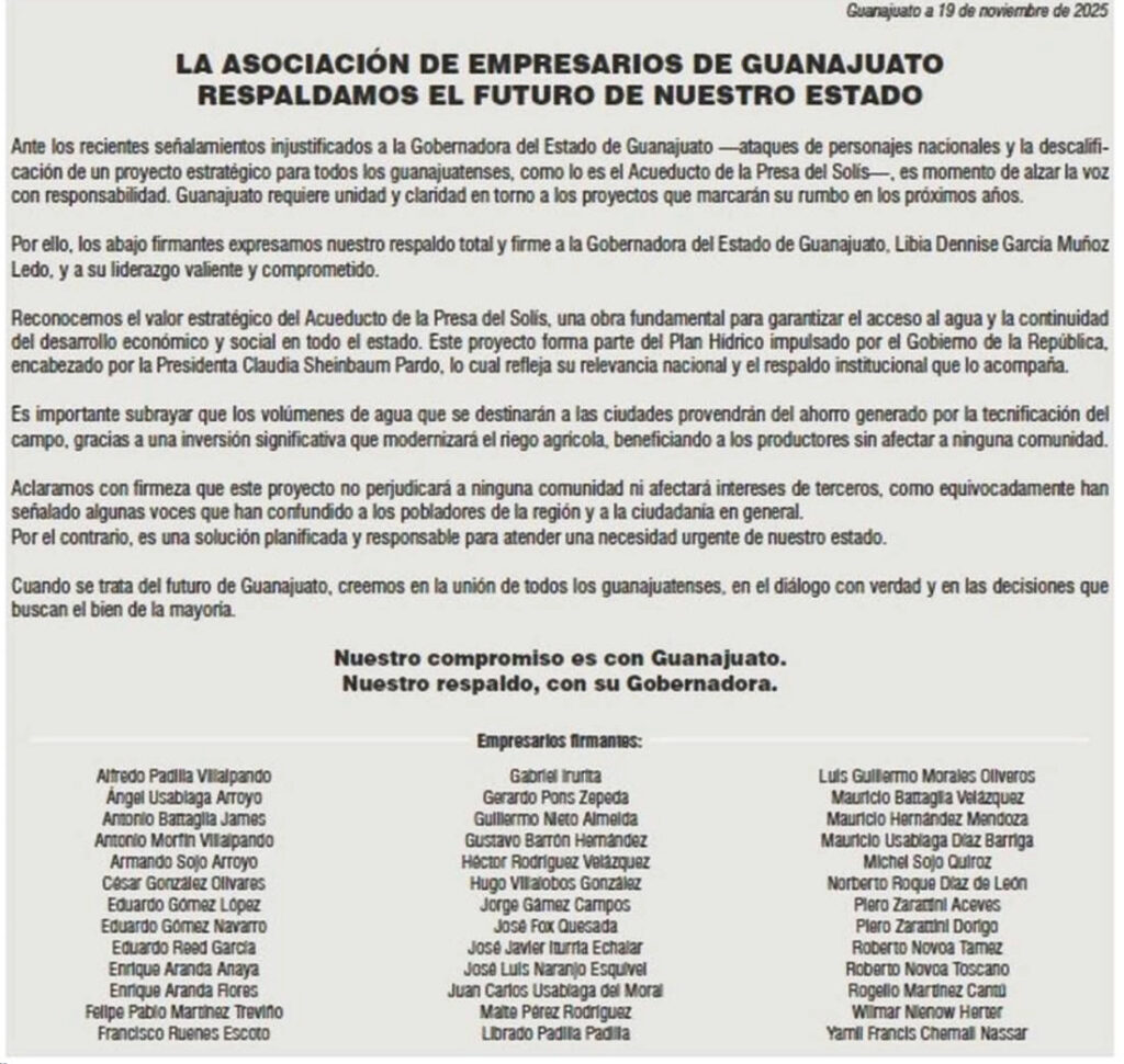 Treinta y ocho “empresarios” dieron su ‘apoyo’ a la obra del Acueducto Solís-León, no sin que se encuentren vinculados a ‘negocios’ que requieren “de bastante agua”