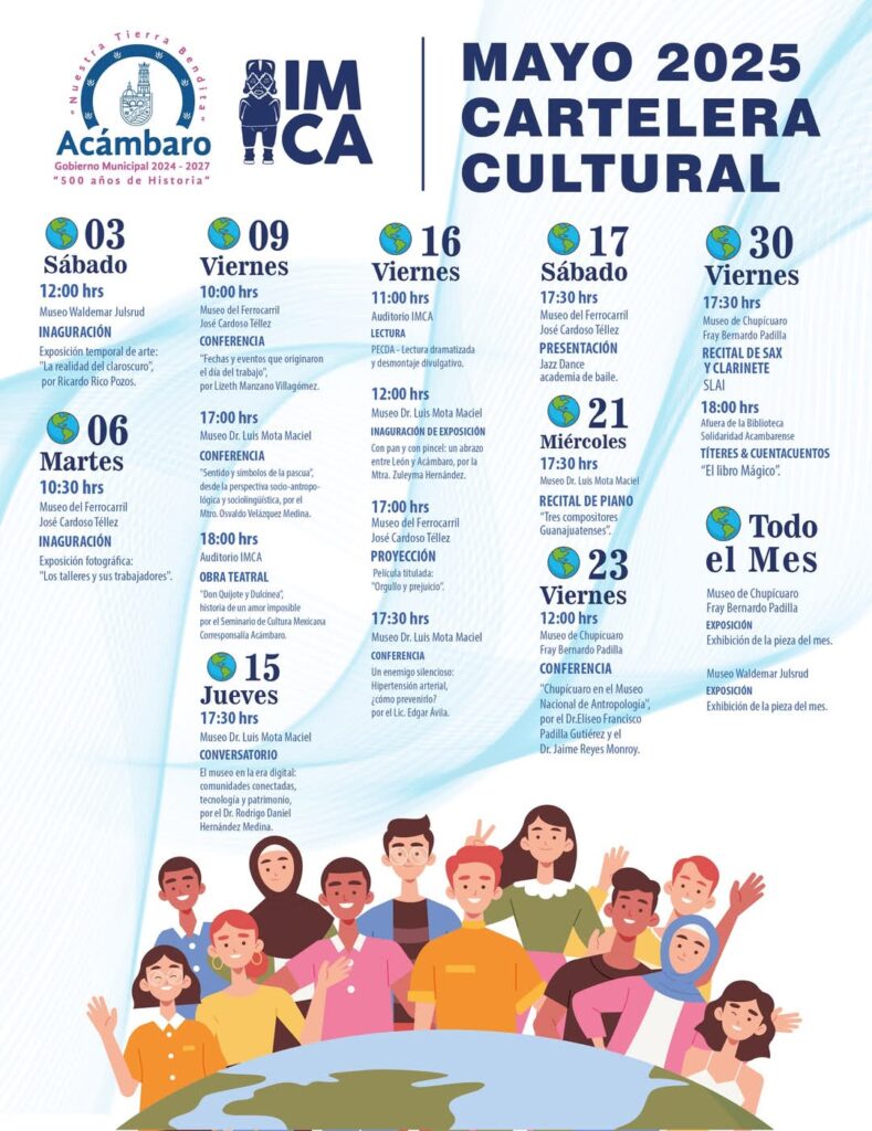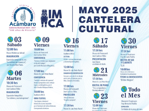 El Instituto de la Cultura de Acámbaro (IMCA) presentó la Cartelera del mes de mayo de 2025;incluye 15 eventos y dos exposiciones permanentes Publicada el 7 mayo, 2025 Fuente: Gobierno de Acámbaro Compartir en redes socialesTweet Share on Telegram (Se abre en una ventana nueva) Telegram Share on WhatsApp (Se abre en una ventana nueva) WhatsApp Me gusta esto:Me gusta Cargando... Relacionado Navegación de entradas « Entre los tipos de café que se consume en el mundo, figura el de Olla de México, hoy re-nombrado “Café Mexicano” por los canadiensesEl Inquisidor: Piden mejor atención en el Hospital General de Acámbaro. Los atrios parroquiales, sitios del clero; no de los gobiernos municipales. Los incendios, entre la impunidad y la falta de vigilancia de la policía. Necesaria, una mejor imagen urbana para la ciudad de Acámbaro. »