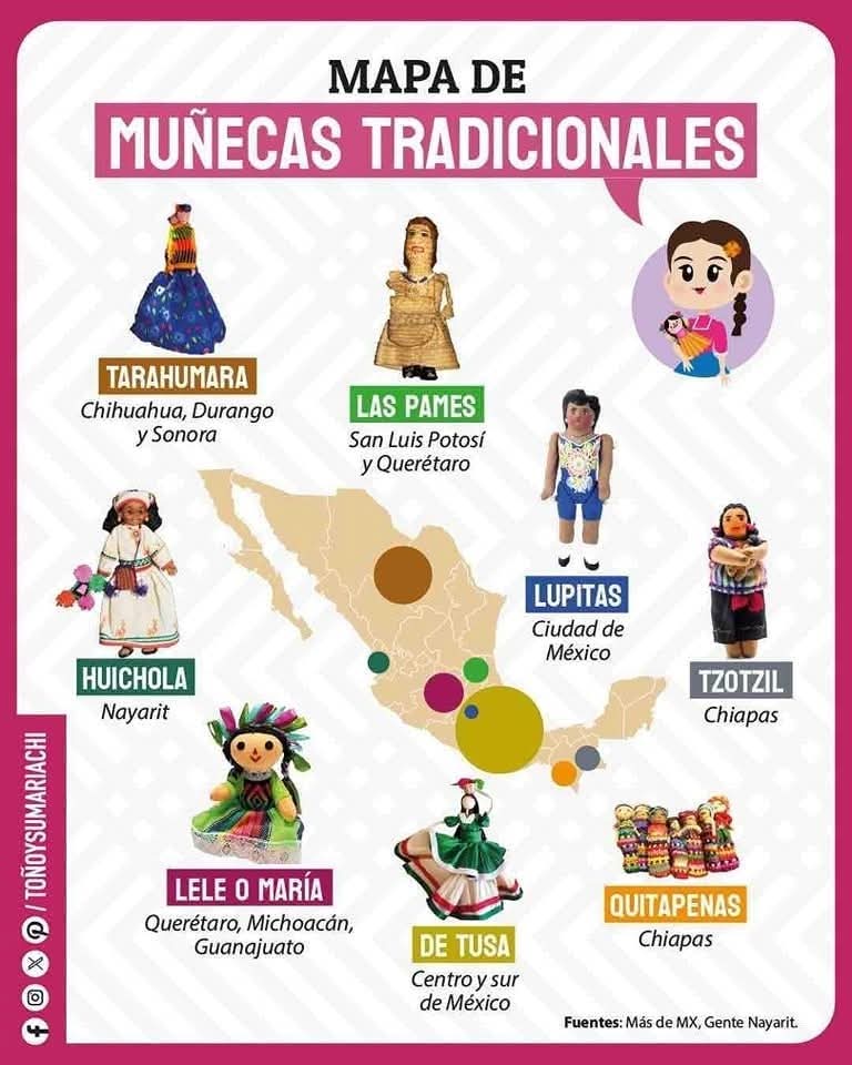 El mapa de las muñecas tradicionales de México incluye 8 modelos o figuras representativas Publicada el 11 abril, 2025 Fuentes: Toñoysumaricahi / Más de MX / Gente Nayarit Compartir en redes socialesTweet Share on Telegram (Se abre en una ventana nueva) Telegram Share on WhatsApp (Se abre en una ventana nueva) WhatsApp Me gusta esto:Me gusta Cargando... Relacionado Navegación de entradas « Promueve el INE Guanajuato la participación ciudadana en la elección de personas juzgadorasGuanajuato consolida su liderazgo en tecnología médica »