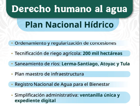 El Plan Nacional Hídrico 2024-2030 busca que el agua sea un derecho humano y no una mercancía. Prevé proyectos de gran envergadura para el país. Publicada el 5 septiembre, 2025 Fuente: Gobierno de México Compartir en redes socialesTweet Share on Telegram (Se abre en una ventana nueva) Telegram Share on WhatsApp (Se abre en una ventana nueva) WhatsApp Me gusta esto:Me gusta Cargando... Relacionado Navegación de entradas « A partir de junio, manténganse actualizado(a) con la programación del periódico digital “El Ciudadano”REFLEXIÓN DOMINICAL DEL PADRE PISTOLAS. EN LUGAR DE JUZGAR, EXAMÍNATE »
