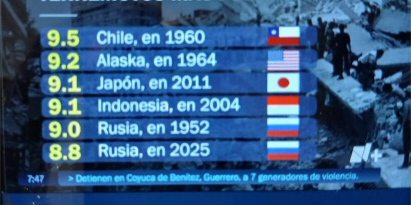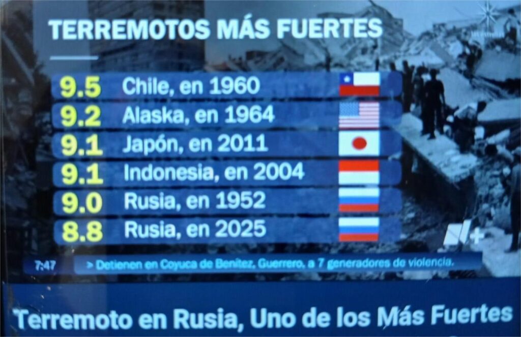 El reciente terremoto de Rusia de 8.8 grados ha sido uno de los de mayor magnitud; no obstante, el más severo es el de Chile de 1960 con 9.5 grados Publicada el 18 agosto, 2025 Fuentes: N+ / Redes Sociales Compartir en redes socialesTweet Share on Telegram (Se abre en una ventana nueva) Telegram Share on WhatsApp (Se abre en una ventana nueva) WhatsApp Me gusta esto:Me gusta Cargando... Relacionado Navegación de entradas « Casa por casa, el personal de la llamada “4T” visitará a la población para ofrecer el servicio médico, sobre todo a los adultos mayoresGuanajuato destaca en el sector manufacturero durante enero-abril de 2025 »