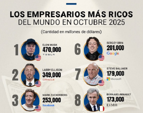 Elon Musk sería hoy en día, el empresario más rico del mundo; su fortuna oscila entre los 470 y los 500 mil millones de dólares Publicada el 12 noviembre, 2025 Fuentes: Bloomberg / El CEO Compartir en redes socialesTweet Share on Telegram (Se abre en una ventana nueva) Telegram Share on WhatsApp (Se abre en una ventana nueva) WhatsApp Me gusta esto:Me gusta Cargando... Relacionado Navegación de entradas « Tiene Guanajuato una cartera de 15 proyectos de energíaGuanajuato dispone de nuevos sectores económicos para diversificar la economía »