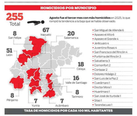 En agosto de 2025, en el Estado de Guanajuato hubo 255 homicidios dolosos; en Acámbaro se registraron 7 Publicada el 6 septiembre, 2025 Fuentes: AM Guanajuato / Al Día Compartir en redes socialesTweet Share on Telegram (Se abre en una ventana nueva) Telegram Share on WhatsApp (Se abre en una ventana nueva) WhatsApp Me gusta esto:Me gusta Cargando... Relacionado Navegación de entradas « REFLEXIÓN DOMINICAL DEL PADRE PISTOLAS. EN LUGAR DE JUZGAR, EXAMÍNATELa alta sismicidad en México se debe a la interacción de las placas tectónicas a nivel continental »