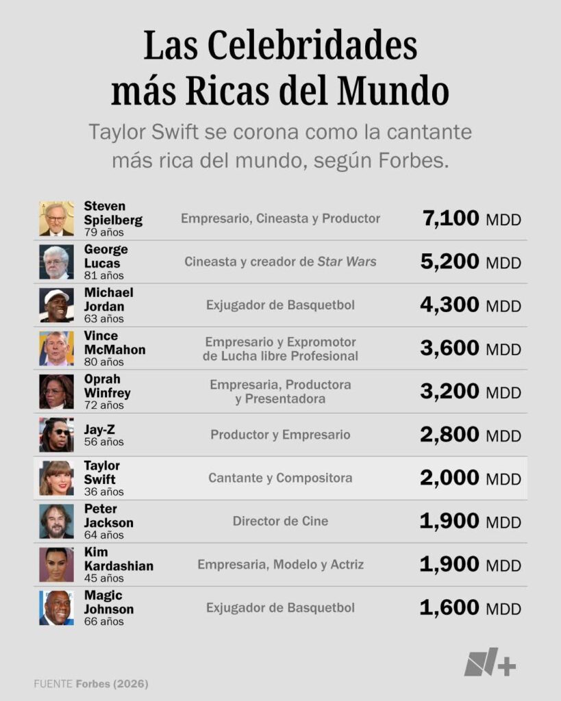 En el 2026, figuran 10 celebridades como las más ricas del mundo Publicada el 28 marzo, 2026 Fuentes: Forbes / N+ Compartir en redes socialesTweet Share on Telegram (Se abre en una ventana nueva) Telegram Share on WhatsApp (Se abre en una ventana nueva) WhatsApp Me gusta esto:Me gusta Cargando... Relacionado Navegación de entradas « Guanajuato certifica a más de 4 mil 300 personas en perfiles laboralesGuanajuato aplica el modelo de las microcredenciales »