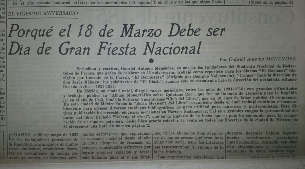 En esa fecha, como se sabe, el Presidente de la República, Gral. Lázaro Cárdenas del Río, llevó a cabo la Expropiación Petrolera en contra de las Compañías Extranjeras, entre ellas, las estadounidenses e inglesas. El Boletín de la SHyCP consigna el suceso en una de sus páginas. La Lic. Anahí Bocanegra Solorio, Encargada del Archivo Histórico Municipal, destacó al respecto que el suceso no debe olvidarse.