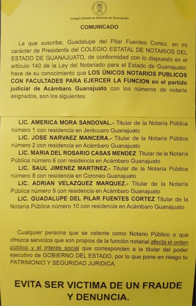 En el Partido Judicial de Acámbaro, Gto., hay 6 Notarios Públicos debidamente acreditados: 4 son de Acámbaro, 1 de Coroneo y 1 más de Jerécuaro. Publicada el 16 agosto, 2025 Fuente: Colegio de Notarios Públicos del Estado de Guanajuato Compartir en redes socialesTweet Share on Telegram (Se abre en una ventana nueva) Telegram Share on WhatsApp (Se abre en una ventana nueva) WhatsApp Me gusta esto:Me gusta Cargando... Relacionado Navegación de entradas « Gobierno de Guanajuato fortalece el empleo y promueve el autoempleoEl Gobierno de Guanajuato acerca más de 16 mil 300 oportunidades laborales »