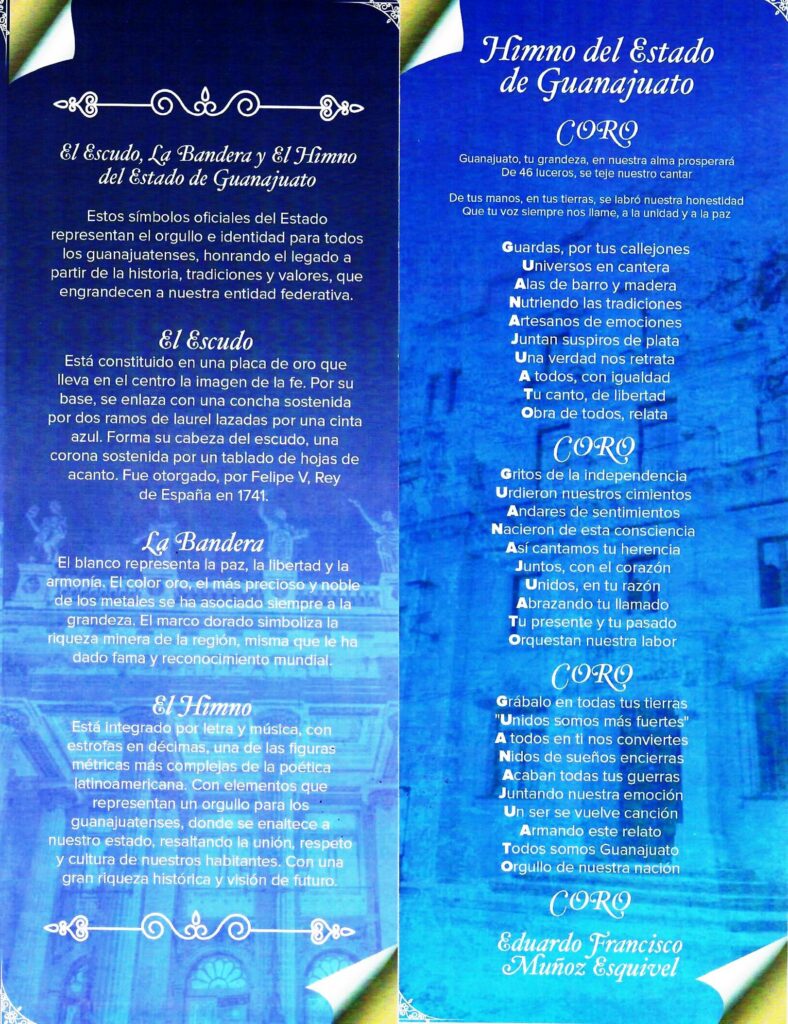 En Guanajuato, los símbolos estatales son el Escudo, la Bandera y el Himno (Conozca la letra del HIMNO ESTATAL) Publicada el 21 marzo, 2026 Fuente: Gobierno del Estado de Guanajuato Compartir en redes socialesTweet Share on Telegram (Se abre en una ventana nueva) Telegram Share on WhatsApp (Se abre en una ventana nueva) WhatsApp Me gusta esto:Me gusta Cargando... Relacionado Navegación de entradas « México sigue siendo una de las mejores gastronomías del mundoGuanajuato aplica el modelo de las microcredenciales »