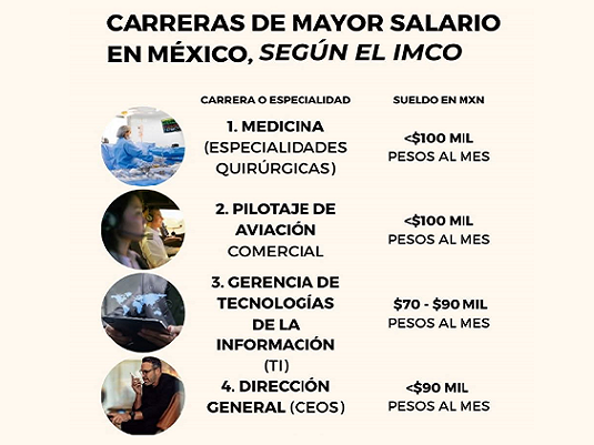 Entre las carreras de un mayor salario en México figura la de Medicina, seguida de la del Pilotaje de un Avión Comercial y en tercer lugar, la de una Gerencia en Tecnologías de la Información.