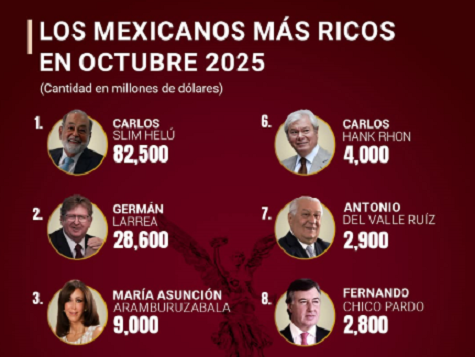Entre los mexicanos más ricos del país, destaca Carlos Slim, quien ostentaría una fortuna superior a los 82 mil millones de dólares Publicada el 9 octubre, 2025 Fuentes: Forbes / El CEO Compartir en redes socialesTweet Share on Telegram (Se abre en una ventana nueva) Telegram Share on WhatsApp (Se abre en una ventana nueva) WhatsApp Me gusta esto:Me gusta Cargando... Relacionado Navegación de entradas « “Mi profe en línea”, un apoyo académico que llega a todos los rincones de GuanajuatoLa ruta del Tren México-León generará inversión y empleo para los municipios del bajío »