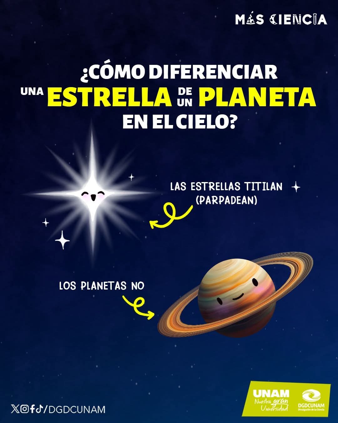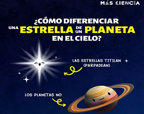 Es importante saber distinguir entre una estrella y un planeta. Las primeras titilan y los segundos, no. Publicada el 15 abril, 2025 Fuente: Universidad Nacional Autónoma de México. Compartir en redes socialesTweet Share on Telegram (Se abre en una ventana nueva) Telegram Share on WhatsApp (Se abre en una ventana nueva) WhatsApp Me gusta esto:Me gusta Cargando... Relacionado Navegación de entradas « Inicia la inscripción para asegurarse un lugar en la preparatoriaLa duración de un año en los planetas de nuestro sistema solar varía; en la Tierra, es de 365 días »