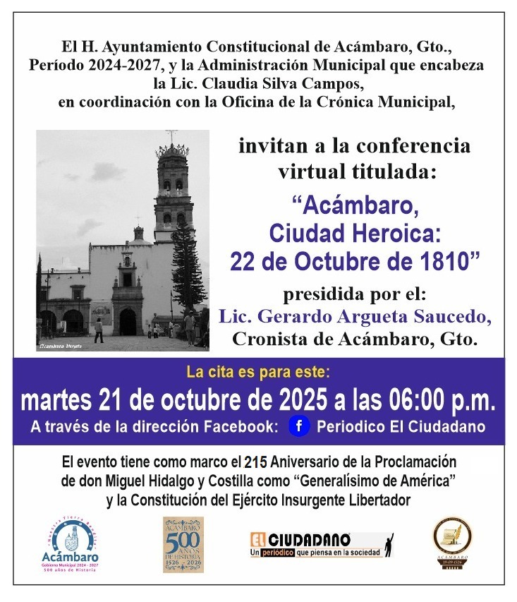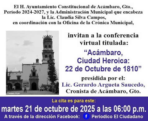 Invitan a conferencia virtual sobre Hidalgo, este martes 21 de octubre de 2025, a las 6 de la tarde Publicada el 20 octubre, 2025 Fuente: Gobierno de Acámbaro, Gto. Compartir en redes socialesTweet Share on Telegram (Se abre en una ventana nueva) Telegram Share on WhatsApp (Se abre en una ventana nueva) WhatsApp Me gusta esto:Me gusta Cargando... Relacionado Navegación de entradas « Inician la construcción de puentes rurales, en AcámbaroInauguran la rehabilitación del camino a La Chicharronera, en su 1ª Etapa e inician los trabajos de la 2ª Etapa »