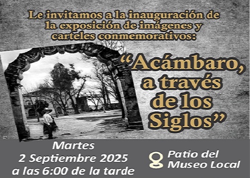 Invitan a interesantes Exposiciones de Fotografía Antigua y Carteles sobre la historia regional de Acámbaro, Gto. Publicada el 1 septiembre, 2025 Fuentes: Gobierno de Acámbaro, Gto. / Museo “Dr. Luis Mota Maciel” Compartir en redes socialesTweet Haz clic para compartir en Telegram (Se abre en una ventana nueva) Telegram Haz clic para compartir en WhatsApp (Se abre en una ventana nueva) WhatsApp Me gusta esto:Me gusta Cargando... Relacionado Navegación de entradas « Ocho son las fases de la Luna que vistas desde la Tierra, constituyen todo un espectáculo astronómicoQue la “Puerta Logística del Bajío” detonará la economía regional de Guanajuato »