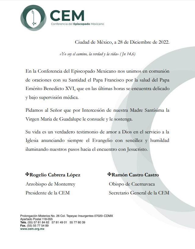 La iglesia católica en México pide oración por el Papa Emérito, Benedicto XVI, quien está delicado de salud Publicada el 28 diciembre, 2022 Compartir en redes socialesTweet Share on Telegram (Se abre en una ventana nueva) Telegram Share on WhatsApp (Se abre en una ventana nueva) WhatsApp Me gusta esto:Me gusta Cargando... Relacionado Navegación de entradas « Guanajuato le apuesta a la preservación de las lenguas maternasEn la actual temporada de frío, las personas deben evitar enfermarse »