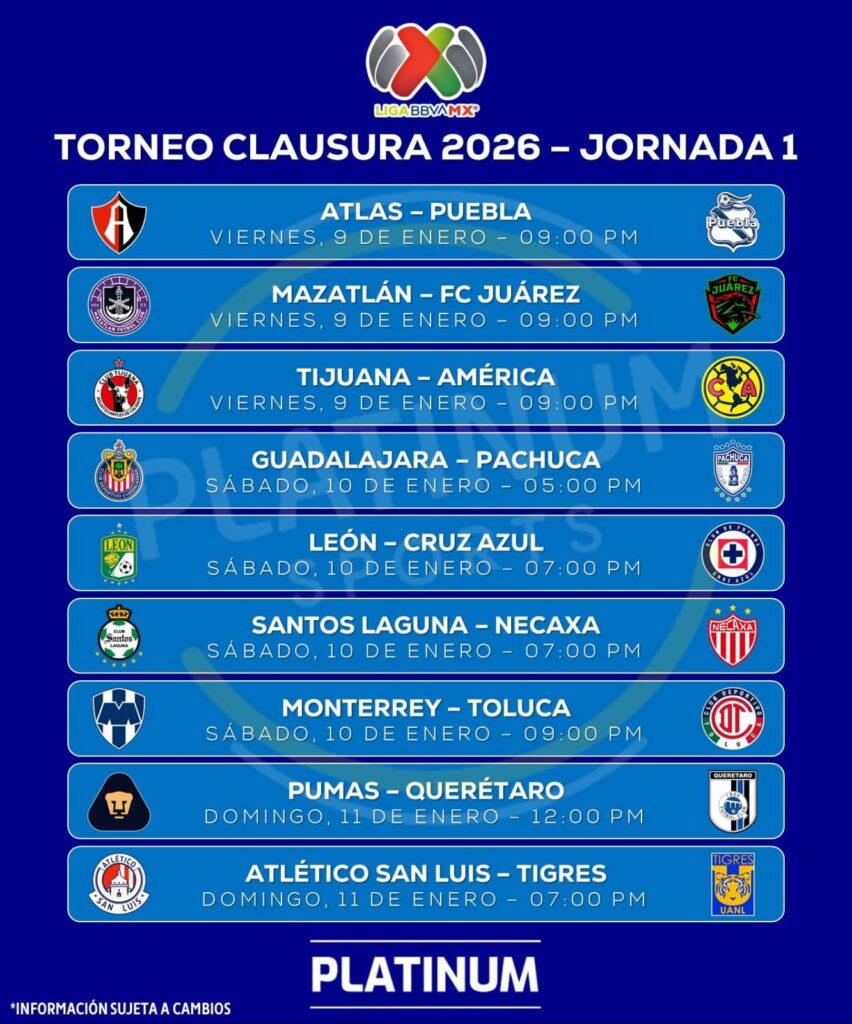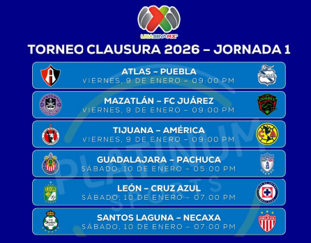 La Jornada 1 de la Liga MX, correspondiente al Torneo de Clausura 2026, inicia el 9 de enero de 2026 Publicada el 3 enero, 2026 Fuentes: FMF / FIFA Compartir en redes socialesTweet Share on Telegram (Se abre en una ventana nueva) Telegram Share on WhatsApp (Se abre en una ventana nueva) WhatsApp Me gusta esto:Me gusta Cargando... Relacionado Navegación de entradas « Guanajuato destaca en el sector manufacturero durante enero-abril de 2025El Gobierno de Guanajuato refuerza el compromiso con la inclusión laboral de las mujeres »
