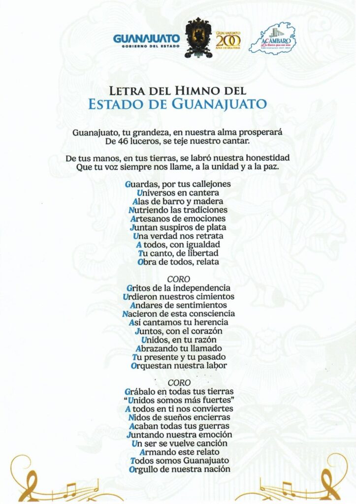 La letra del himno del Estado de Guanajuato refiere a su grandeza y unidad de su gente; como también al orgullo de ser parte de la nación Publicada el 24 agosto, 2025 Fuente: Gobierno del Estado de Guanajuato Compartir en redes socialesTweet Haz clic para compartir en Telegram (Se abre en una ventana nueva) Telegram Haz clic para compartir en WhatsApp (Se abre en una ventana nueva) WhatsApp Me gusta esto:Me gusta Cargando... Relacionado Navegación de entradas « El ciclo escolar 2025-2026 inicia el 1 de septiembre para educación básicaGobierno de Guanajuato fortalece el empleo y promueve el autoempleo »