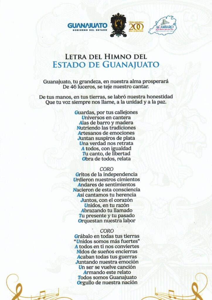 La letra del himno del Estado de Guanajuato refiere a su grandeza y unidad de su gente; como también al orgullo de ser parte de la nación Publicada el 21 marzo, 2026 Fuente: Gobierno del Estado de Guanajuato Compartir en redes socialesTweet Share on Telegram (Se abre en una ventana nueva) Telegram Share on WhatsApp (Se abre en una ventana nueva) WhatsApp Me gusta esto:Me gusta Cargando... Relacionado Navegación de entradas « Guanajuato aplica el modelo de las microcredencialesLa Cruz Roja Mexicana, Delegación “Acámbaro”, ofrece servicio médico a la población. »