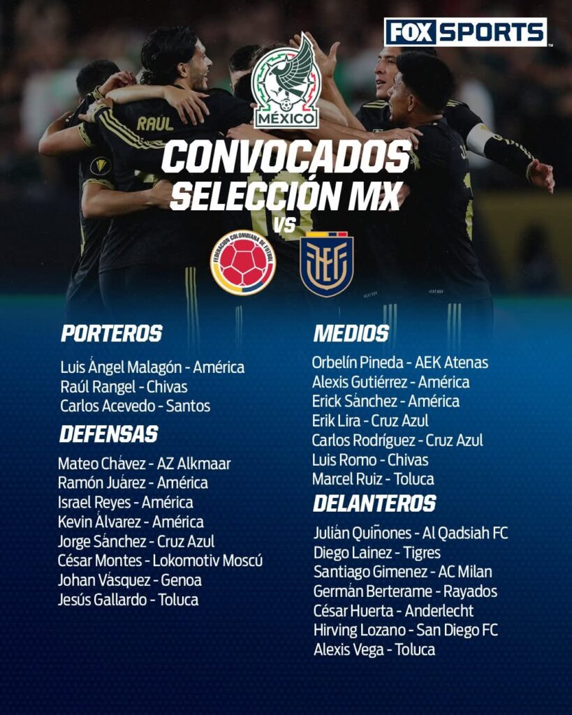 La lista de jugadores convocados por Javier Aguirre para los partidos contra Colombia y Ecuador, son por ahora “lo mejor que tiene” Publicada el 9 octubre, 2025 Fuentes: FOX SPORTS / FMF / FIFA Compartir en redes socialesTweet Share on Telegram (Se abre en una ventana nueva) Telegram Share on WhatsApp (Se abre en una ventana nueva) WhatsApp Me gusta esto:Me gusta Cargando... Relacionado Navegación de entradas « MIPYMES en Guanajuato generan oportunidades para la gente“Mi profe en línea”, un apoyo académico que llega a todos los rincones de Guanajuato »