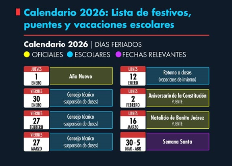 La Secretaría de Educación Pública confirmó el Calendario 2026, que incluye días festivos, puentes y vacaciones Publicada el 2 febrero, 2026 Fuentes: LFT / SEP / El Economista Compartir en redes socialesTweet Share on Telegram (Se abre en una ventana nueva) Telegram Share on WhatsApp (Se abre en una ventana nueva) WhatsApp Me gusta esto:Me gusta Cargando... Relacionado Navegación de entradas « México y Canadá son de los principales socios comerciales de Estados UnidosEl Gobierno de Guanajuato acerca más de 16 mil 300 oportunidades laborales »