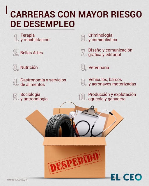 La terapia y la rehabilitación sería una de las carreras en México con mayor riesgo de generar desempleo. Otras son las de Nutrición y Sociología. Publicada el 2 marzo, 2026 Fuentes: IMCO 2024 / EL CEO Compartir en redes socialesTweet Share on Telegram (Se abre en una ventana nueva) Telegram Share on WhatsApp (Se abre en una ventana nueva) WhatsApp Me gusta esto:Me gusta Cargando... Relacionado Navegación de entradas « El Gobierno de Guanajuato refuerza el compromiso con la inclusión laboral de las mujeresSe ha demostrado que con la Inteligencia Artificial, ésta trabaja más rápido que el ser humano »