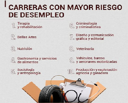 La terapia y la rehabilitación sería una de las carreras en México con mayor riesgo de generar desempleo. Otras son las de Nutrición y Sociología. Publicada el 25 noviembre, 2025 Fuentes: IMCO 2024 / EL CEO Compartir en redes socialesTweet Share on Telegram (Se abre en una ventana nueva) Telegram Share on WhatsApp (Se abre en una ventana nueva) WhatsApp Me gusta esto:Me gusta Cargando... Relacionado Navegación de entradas « La gastronomía mexicana es una de las más ricas del mundoVigente, la BAIT de la PROFECO, una plataforma de conciliación en línea »