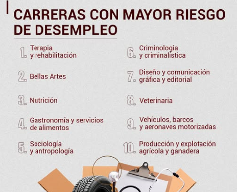 La terapia y la rehabilitación sería una de las carreras en México con mayor riesgo de generar desempleo. Otras son las de Nutrición y Sociología. Publicada el 20 enero, 2026 Fuentes: IMCO 2024 / EL CEO Compartir en redes socialesTweet Share on Telegram (Se abre en una ventana nueva) Telegram Share on WhatsApp (Se abre en una ventana nueva) WhatsApp Me gusta esto:Me gusta Cargando... Relacionado Navegación de entradas « Marca Guanajuato sigue impulsando la economía regional de GuanajuatoEl mezcal y el tequila son dos bebidas que “representan” a México en casi toda clase de eventos gastronómicos, incluso en el extranjero »