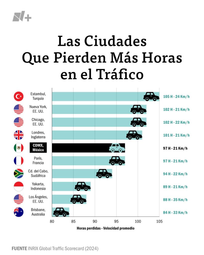 Las ciudades de Estambul y Nueva York son las que más horas propician en la pérdida de tiempo por el traslado en automóvil; México está en quinto lugar. Publicada el 22 abril, 2025 Fuente: INDIX Global World Scorecard, 2024 Compartir en redes socialesTweet Share on Telegram (Se abre en una ventana nueva) Telegram Share on WhatsApp (Se abre en una ventana nueva) WhatsApp Me gusta esto:Me gusta Cargando... Relacionado Navegación de entradas « En México hay 29 Estados que cuentan con un equipo profesional de fútbol; Guanajuato, por ejemplo, dispone de seis en diferentes categoríasPromueven el consumo de alimentos saludables en tiendas escolares »
