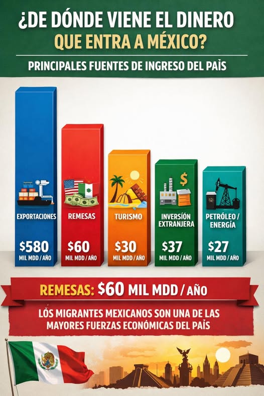 Las exportaciones, las remesas y el turismo son las principales fuentes de ingreso de México como país Publicada el 6 febrero, 2026 Fuente: SHyCP: Gobierno de México Compartir en redes socialesTweet Share on Telegram (Se abre en una ventana nueva) Telegram Share on WhatsApp (Se abre en una ventana nueva) WhatsApp Me gusta esto:Me gusta Cargando... Relacionado Navegación de entradas « “Marca Guanajuato” genera y conserva más de 200 mil empleosTiene Guanajuato una cartera de 15 proyectos de energía »
