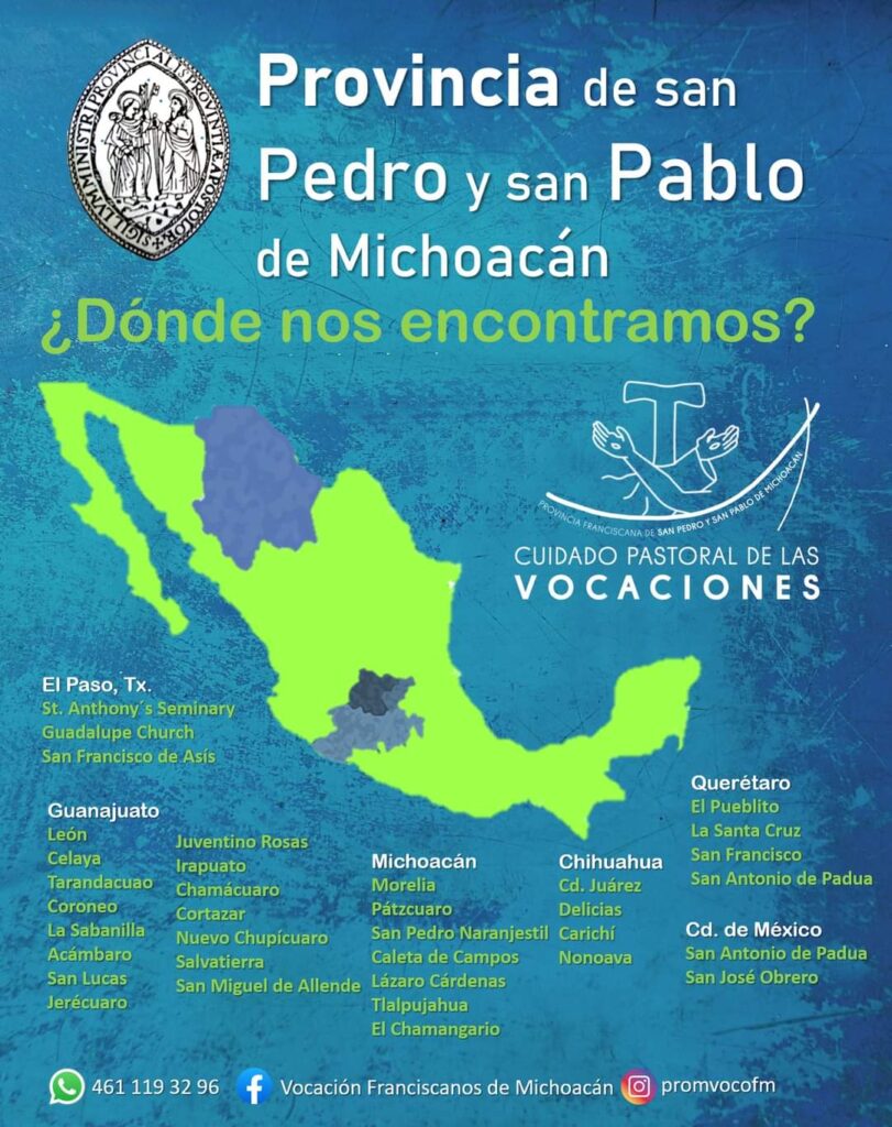 Los Estados de Michoacán, Guanajuato y Chihuahua forman parte de la Provincia Franciscana de San Pedro y San Pablo Publicada el 22 abril, 2026 Fuente: Iglesia Católica Compartir en redes socialesTweet Share on Telegram (Se abre en una ventana nueva) Telegram Share on WhatsApp (Se abre en una ventana nueva) WhatsApp Me gusta esto:Me gusta Cargando... Relacionado Navegación de entradas « La letra del himno del Estado de Guanajuato refiere a su grandeza y unidad de su gente; como también al orgullo de ser parte de la nación mexicana.El Inquisidor: Gestionan la Planta Tratadora de Aguas Residuales para el Rastro de Acámbaro. “Lederes” del Movimiento “No al Acueducto de Solís”, juegan a la ‘doble carta’. Integran a la Secretaría de Turismo al Consejo Consultivo del sector. Alertan sobre un “Corredor Comercial” en el Andador “Juárez” de Acámbaro. »