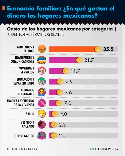Los mexicanos gastan más en alimentos y bebidas, pero también en transporte público Publicada el 19 abril, 2026 Fuentes: INEGI / El Economista Compartir en redes socialesTweet Share on Telegram (Se abre en una ventana nueva) Telegram Share on WhatsApp (Se abre en una ventana nueva) WhatsApp Me gusta esto:Me gusta Cargando... Relacionado Navegación de entradas « México produce más hortalizas que los Estados Unidos de América, pero el principal mercado es el mismo vecino país del norte
