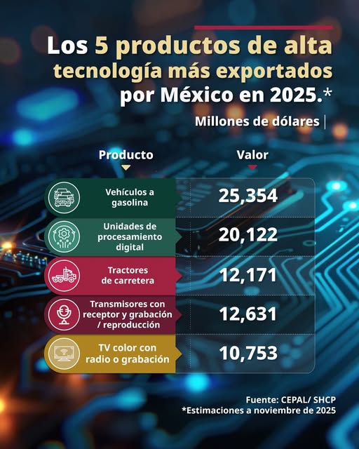 Los vehículos a gasolina son el principal producto de tecnología que exporta México Publicada el 5 marzo, 2026 Fuente: Secretaría de Hacienda y Crédito Público Compartir en redes socialesTweet Share on Telegram (Se abre en una ventana nueva) Telegram Share on WhatsApp (Se abre en una ventana nueva) WhatsApp Me gusta esto:Me gusta Cargando... Relacionado Navegación de entradas « La Cruz Roja Mexicana, Delegación “Acámbaro”, ofrece servicio médico a la población.Profeco asesora a paisanos que envían dinero de Estados Unidos a México »