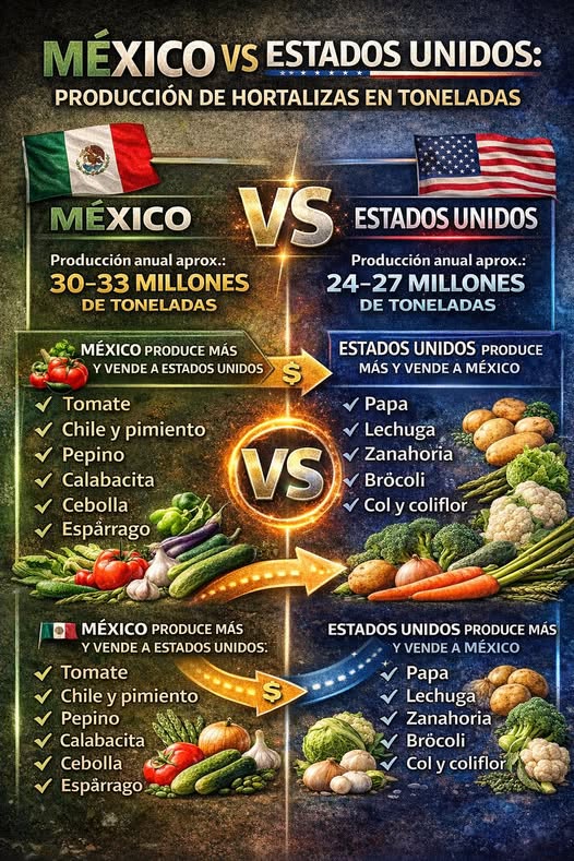 México produce más hortalizas que los Estados Unidos de América, pero el principal mercado es el mismo vecino país del norte Publicada el 5 abril, 2026 Fuentes: Gobiernos de México y EEUU Compartir en redes socialesTweet Share on Telegram (Se abre en una ventana nueva) Telegram Share on WhatsApp (Se abre en una ventana nueva) WhatsApp Me gusta esto:Me gusta Cargando... Relacionado Navegación de entradas « Vigente, la BAIT de la PROFECO, una plataforma de conciliación en línea“Marca Guanajuato” genera y conserva más de 200 mil empleos »