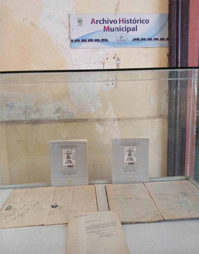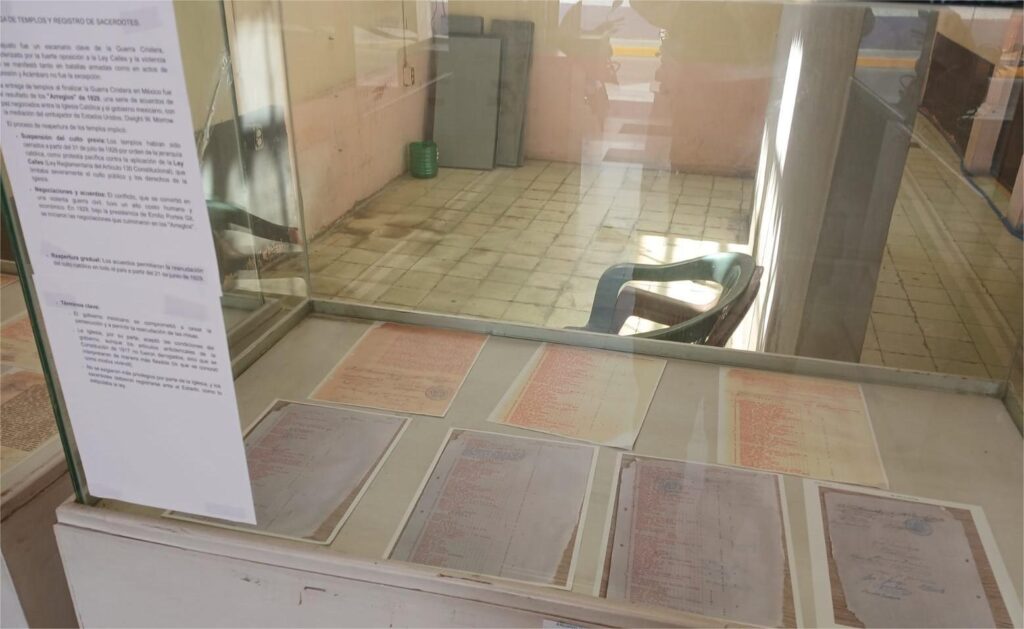 En ese sentido, se muestra un libro de registro de sacerdotes y otro sobre actas de entrega de templos de 1929, el año que terminó la Guerra Cristera. A su vez, figuran una serie de actas e inventarios (1926) y de entrega (1929) de los templos de la localidad como el de San Francisco de Asís, la Soledad y el Santo Ecce-Homo, detalló la Directora del lugar, Lic. Anahí Bocanegra Solorio. A su vez, el Cronista del municipio, Lic. Gerardo Argueta Saucedo, invitó a visitar el sitio y conocer una parte relevante de la Guerra Cristera en la región de Acámbaro.