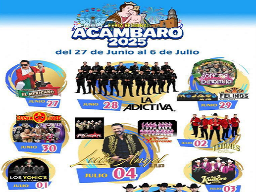 Programa de la Feria Regional de Acámbaro, Edición 2025. Está vigente del 27 de junio al 6 de julio Publicada el 14 junio, 2025 Fuente: Gobierno de Acámbaro, Gto. Compartir en redes socialesTweet Share on Telegram (Se abre en una ventana nueva) Telegram Share on WhatsApp (Se abre en una ventana nueva) WhatsApp Me gusta esto:Me gusta Cargando... Relacionado Navegación de entradas « REFLEXIÓN DOMINICAL DEL PADRE PISTOLASGuanajuato le dice “¡sí a la vida!” »