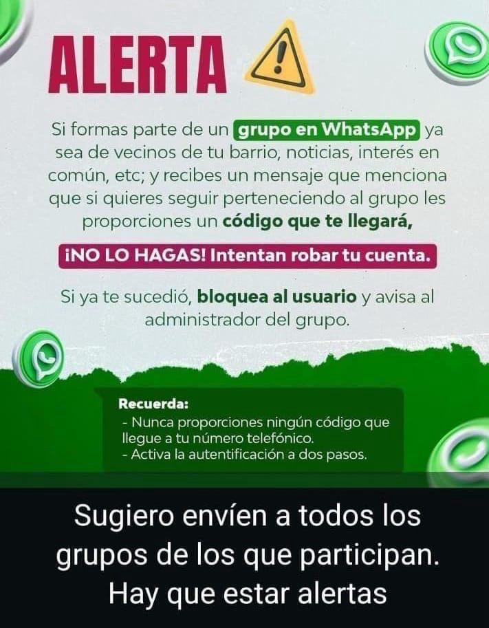 Se advierte que el robo de cuenta de WhatsApp es real, por ello, es conveniente bloquear a usuarios sospechosos Publicada el 28 agosto, 2025 Fuente: Redes Sociales Compartir en redes socialesTweet Share on Telegram (Se abre en una ventana nueva) Telegram Share on WhatsApp (Se abre en una ventana nueva) WhatsApp Me gusta esto:Me gusta Cargando... Relacionado Navegación de entradas « “Marca Guanajuato” genera y conserva más de 200 mil empleosEntregan el camino con pavimento asfáltico en la comunidad de San Cayetano »