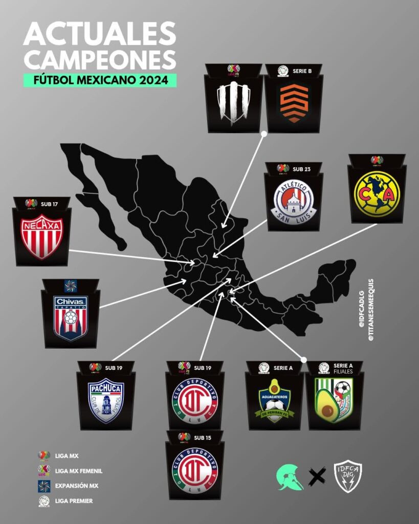 Son 11 los Campeones actuales del fútbol mexicano que consiguieron un título en el 2024 Publicada el 15 abril, 2025 Fuentes: FMF / Liga MX / @IDFCADLG / @TITANESEMEEQUIS Compartir en redes socialesTweet Share on Telegram (Se abre en una ventana nueva) Telegram Share on WhatsApp (Se abre en una ventana nueva) WhatsApp Me gusta esto:Me gusta Cargando... Relacionado Navegación de entradas « Anuncian la prepa con “Mi Profe en Línea”, que ofrece asesorías gratis en tiempo realInicia la inscripción para asegurarse un lugar en la preparatoria »